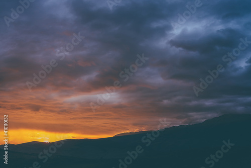 Atmospheric landscape with silhouettes of mountains with trees on background of vivid orange blue violet dawn sky. Colorful nature scenery with sunset or sunrise of illuminating color. Sundown paysage