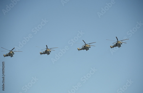 Attack helicopters "Mi-35M" during a rehearsal of the parade dedicated to the 72 anniversary of the Victory in the great Patriotic war.