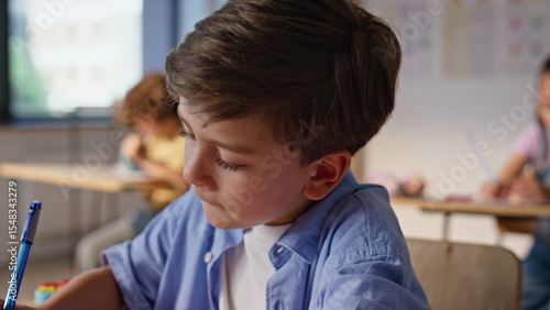 Attentive boy studying lesson sitting classroom desk closeup. Schoolboy writing