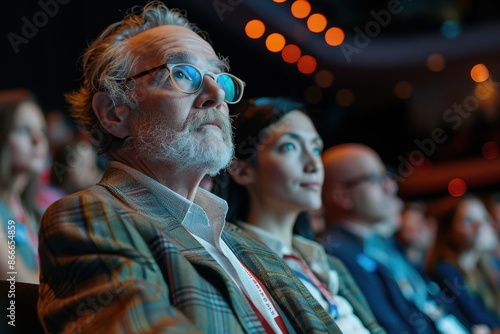 man, elderly, conference, attentive, audience, goggles, beard, plaid, jacket, grey, hair, white, sitting, listening, event, speaker, presentation, focused, serious, engaged, bright, light, blurry, background, people, row, formal, professional, business, indoor, closeup, portrait, head, shoulder, thoughtful, curious, interested
