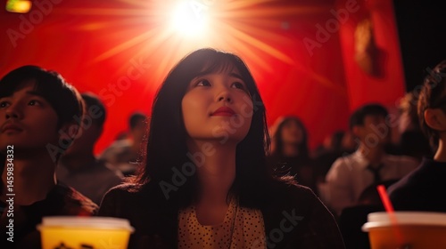 woman, motion picture, theatre, audience, attentive, young, light, dim, red, seated, people, dark, looking, up, enjoying, film, cinema, entertainment, light, sharpened, watching, glowing, patterned, drink, cup, bright, shadow, evening, crowd, show, night, showing, expression, spectacle, celebration, celebratory, beam