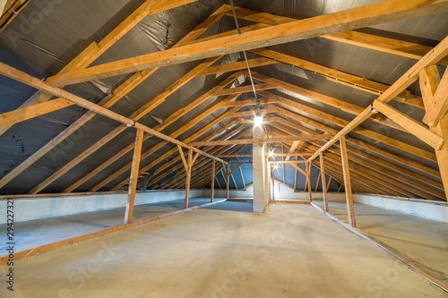 Attic of a building with wooden beams of a roof structure.