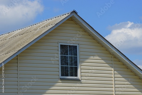 attic of a gray house with a small window against a blue sky and clouds