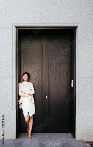 businesswoman, city, exterior, design, architecture, building, standing, door, doorway, looking away, vertical, pensive, serious, arms crossed, tied-up, elegant, elegance, thinks, suit, portrait, beautiful, street, background, modern, stylish, coiffure, urban, summer, style, brunette, attractive, adult, young, woman, 1, person, female, business, lifestyle