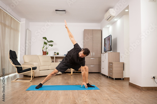 Attractive man trying extended side Yoga poses on his house floor. Athletic training.