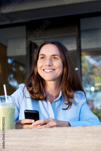 adult, aged, attractive, background, beautiful, beauty, brunette, casual attire, caucasian, mobile phone, mobile phone, drink, enjoy, expression, face, female, hand, happiness, happy, holding, juice, lady, leisure, life, lifestyle, looking, middle, mobile, model, modern, natural, older, 1, outdoors, outside, people, person, phone, portrait, relax, relaxation, sitting, smart, smiling, phone, text, white, woman