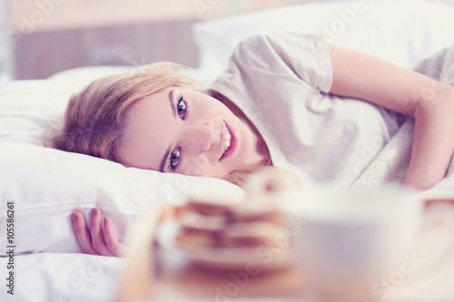 attractive, background, beautiful, bed, bedchamber, blond, blurred, bright, caucasian, closeup, colours, comfort, cookie, cosy, cup, drink, enjoying, female, girl, gorgeous, grey, hair, hand, home, house, human, light, morning, natural, pajama, pajama, people, person, pillow, pleasant, pretty, relax, room, sensuality, shirt, smile, sunlight, table, tea, waking, wear, white, woman, young