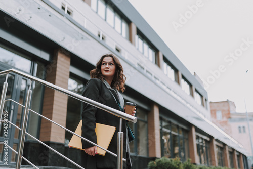 caucasian, city, beverage, young, promenade, coat, dictionary, specialist, outdoors, beautiful, modern, city landscape, spectacle, hot drink, goggles, lovely, studying, alone, calm, hot, pretty, college, cyclopaedia, cup, stroll, casual attire, waist up, student, lady, walk, book, smart, woman, building, leisure, learning, architecture, female, paper, drink, clever, adult, literature, bespectacled, read, office, attractive, stair