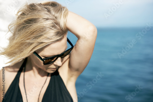 woman, blond, attractive, pretty, sunglasses, summer, sun, sea, see, water, wind, windy, stormy, long hair, hair, outside, boat, ship, sunny, beaming, fun, high spirits, enjoy, vacation, relaxation, high spirits, laugh, smile, time out, pensive, sensual, tempting, energy, athletic, dress, fashion, black