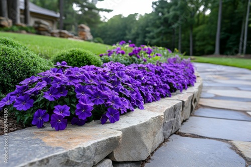 Aubrieta in full bloom along the edge of a stone walkway, its vibrant flowers adding life to the path