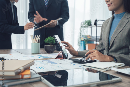 Auditor and accountant team working in office, analyze financial data and accounting record with calculator. Accounting company provide finance and taxation planning for profitable cash flow. Insight