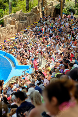 public, audience, park, animal, spectacular, marin, spanish, view, top, up high, event, outdoors, area, vertical, dolphin, pool, children, children, fun, amusement, human, many, lot, sunny day, spain, animal, pleasure, looking, auditorium, viewer, row, performance, spectator, sitting, seat, day, family, attendance, crowd, entertainment, show, leisure, watching, editorial, people