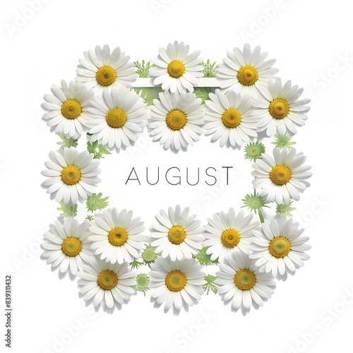 august, text, center, frame, daisy, flower, floral, nature, white background, seasonal, typography, summer, greeting, celebration, botanical, sunny, vibrant, cheerful, copy space, fresh