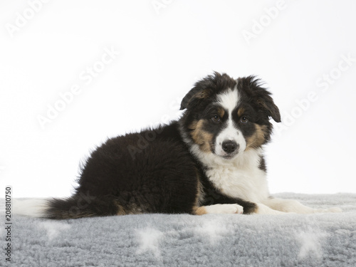 Australian shepherd dog puppy in a studio with white background. 11 weeks old puppy isolated on white.