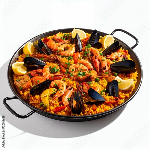 paella, seafood, spanish, cookery, rice, dish, lemon, mussel, shrimp, saffron, delicacy, meal, epicure, culinary, flavorful, mediterranean, preparation, gastronomy, traditional, delicious, vibrant, pea, seafood, appetising, dinner, lunchtime, nourishment, lunch, eatery, receipe, plate, culture, serving, portion, background, white, isolated, closeup, studio, tasty, presentation