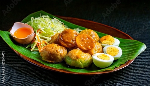 Authentic Siomay Bandung served on a banana leaf with peanut sauce, boiled eggs, cabbage, and fresh vegetables. Perfect for food photography, culinary blogs, and Indonesian cuisine themes.