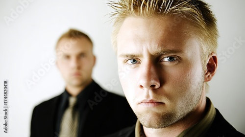 authority. Two businessmen in suits, projecting professionalism and teamwork in a neutral, softly lit environment. pitch deck slides.