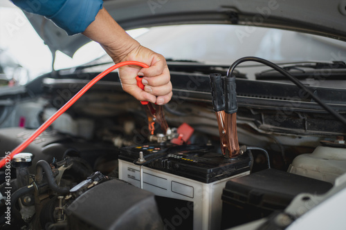 Auto mechanic is charging the battery. Auto repair service center.