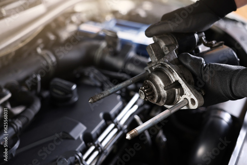 Auto part. Professional mechanic with starter motor near open hood of car indoors, closeup