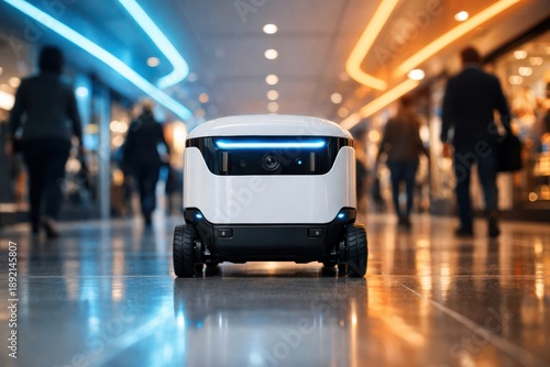 Automated Delivery Robot in Commercial Precinct: A futuristic autonomous delivery robot navigates a modern shopping center, hinting at the automation reshaping urban areas.