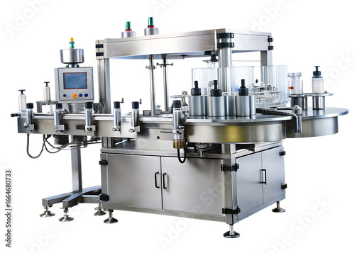 Automatic bottle labeling machine with a rotary carousel for a pharmaceutical production line on white Background ,PNG. AI.Generated.