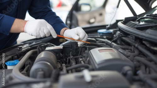 Automotive Inspection: A skilled technician, adorned in protective gloves, meticulously inspects a car engine, reflecting dedication to quality service and automobile maintenance.
