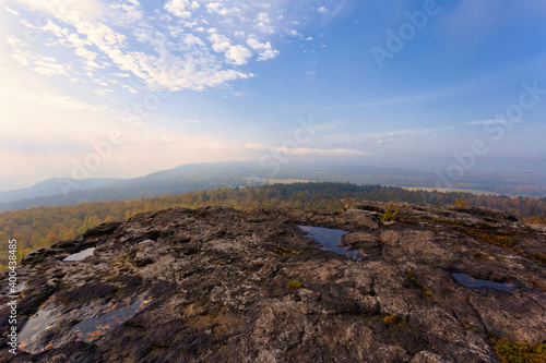 Autumn foggy morning in the deciduous forest. The low sun shines through the trees and fog and paints in the leaves and tall grass. Mountain landscape around the hill Decinsky Sneznik in northwestern