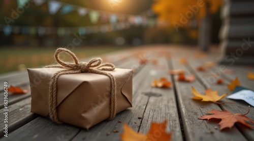 autumn, fall, gift, present, wrapped, package, rustic, wooden, bench, leaf, maple leaf, fall leaf, thanksgiving, birthday, celebration, festive, bunting, sunset, sunlight, warm, cosy, heartwarming, nature, seasonal, october, november, gratitude, surprise, simple, elegant, brown, beige, twine, string, bow