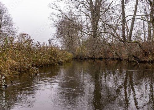 autumn landscape gray and cloudy day, river bank with bare trees and bushes, bank reflection in river water