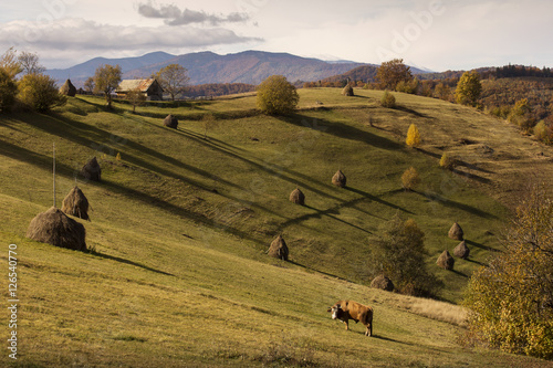 Autumn landscape hills in Romania County, traditional village