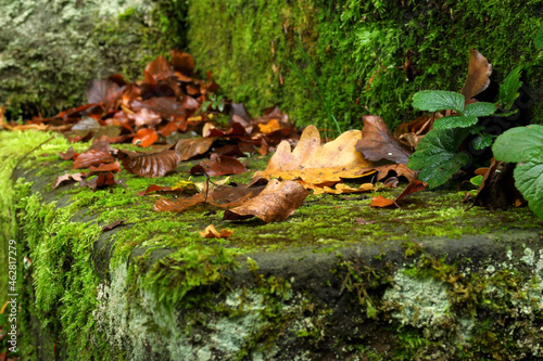autumn, leaf, lying, moss-covered, stone, step, outdoors, day, closeup, plant, season, german, connection, forest, saxony, elba, sandstone, mountain, nobody, nature, fragility, moss, rock
