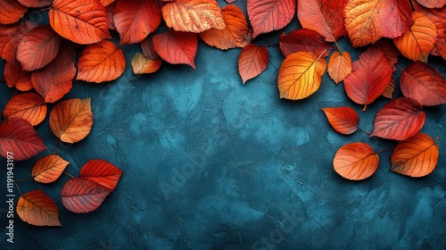 leaf, autumn, fall, red, orange, teal, background, texture, design, seasonal, nature, foliage, colourful, vibrant, photo, october, november, september, harvest, rustic, still, life, arrangement, decor, composition, image, picture, frame, border, template, holiday, thanksgiving, plant, flora, colours, overhead, shot, view