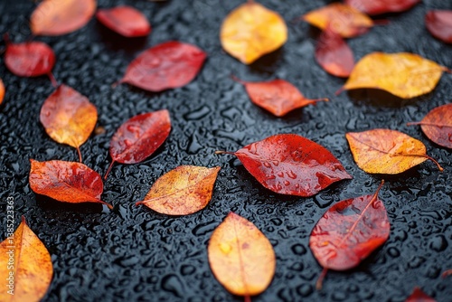 leaf, autumn, fall, red, gold, orange, wet, asphalt, water, drop, nature, season, foliage, colourful, vibrant, texture, background, macro, photo, closeup, detail, surface, dark, ground, pattern, design, still life, beauty, natural, element, colours, shades, wetness, autumn, flora, plant, leaf, seasonal