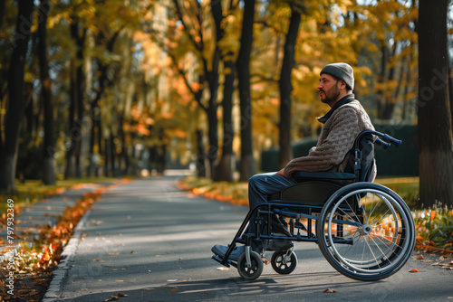 wheelchair, autumn, path, man, serene, peaceful, foliage, outdoors, nature, leaf, fall, tranquil, park, mobility, accessibility, independence, relaxation, scenic, quiet, contemplative, season, gold, leisure, journey, solitude, calmness