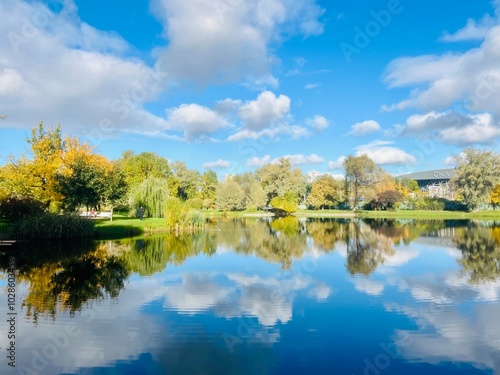 autumn trees reflection on the lake surface, blue lake reflection, golden autumn, lake in the park with quiet water as a mirror