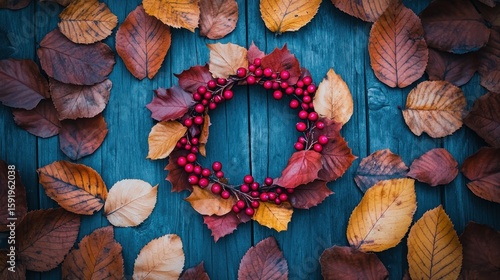 chaplet, autumn, fall, leaf, berry, decor, circle, nature, rustic, wood, blue, orange, red, brown, natural, decorative, hand-made, craft, festive, home, garden, decorating, autumn, cosy, leaf, display, ornamental, arrangement, seasonal, art, design, photo, image, background, pattern, texture, vintage, tree branch, floral