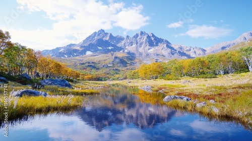 nature, landscape, mountain, lake, autumn, fall, foliage, tree, sky, cloud, water, rock, scenery, view, travel, wilderness, scenic, beautiful, tranquil, serene, peaceful, calm, majestic, vibrant, colourful, yellow, orange, red, green, blue, bright, sunlight, day, season, environment, park, area, vista, panorama, image, photo, photo, picture, background