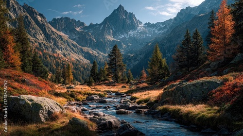 autumn, mountain, landscape, fiery, red, foliage, towering, peak, crystal, river, soft, sunlight, vibrant, texture, panoramic, view, natural, serenity
