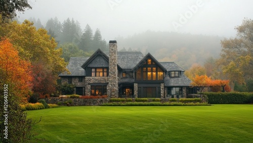 house, luxury home, stone, autumn, fall, tree, fog, mist, landscape, nature, forest, wood, leaf, colours, green, grass, yard, lawn, home, building, architecture, residential, estate, property, luxury, elegant, exterior, design, scenic, view, photo, image, picture, photo, autumn, season, day, morning, wide, angle