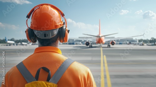 Aviation safety, man in safety helmet overseeing airplane ground operations at the airport