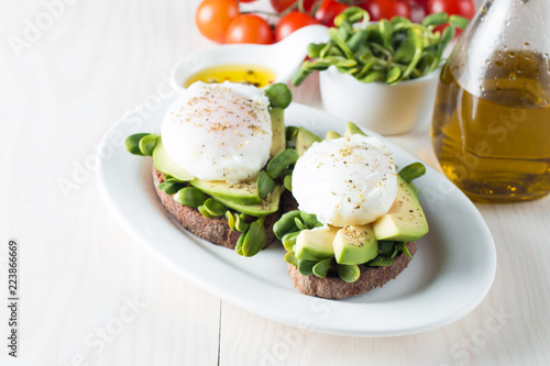 Avocado toast, cherry tomato on wooden background. Breakfast with toast avocado, vegetarian food, healthy diet concept. Healthy sandwich with avocado and poached eggs.