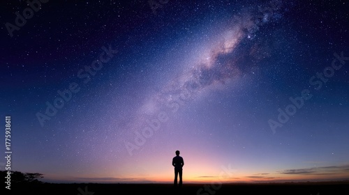 night, sky, star, galaxy, milky way, silhouette, person, nature, landscape, astronomy, universe, horizon, calmness, exploration, solitude, beauty, darkness, cosmic, wonder, earth, dream, peace, night sky, outdoors, imagination, stillness, awe, illumination, scenery, celestial, immensity, twilight, mystery, night photography, view, space, travel, adventure, journey, aethereal, peaceful