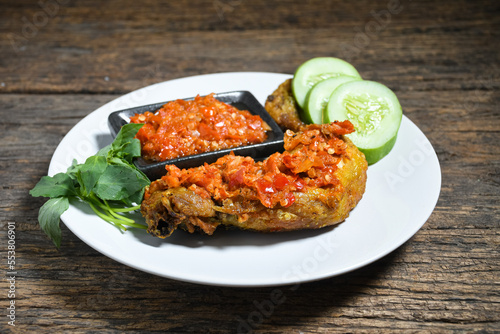 Ayam geprek sambal indonesian food or geprek fried chicken with sambal hot chili sauce. Selective Focus