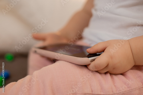 Baby blonde girl plays with the phone at home on the bed. Children and technology