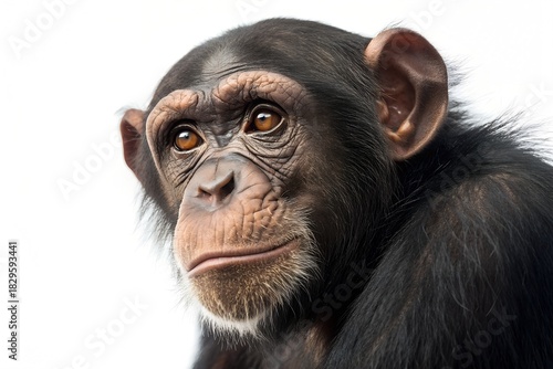 baby, bonobo, primate, ape, chimpanzee, animal, wildlife, nature, cute, young, sitting, portrait, looking, eye, face, white, background, endangered, jungle, forest, creature, funny, expression, thoughtful, adorable, innocence, curious, playful, small, tiny, mammal, wild, exotic, primate, species, closeup, isolated, head shot, monkey, peaceful, calm, alert, intelligent