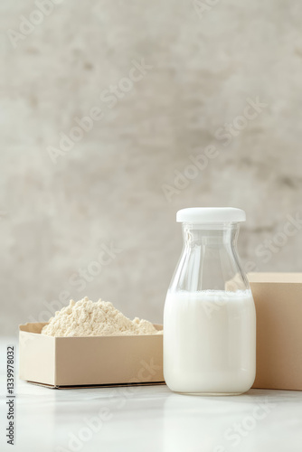 Baby bottle with milk for infant feeding and carton box package mockup of powdered formula to make milk.