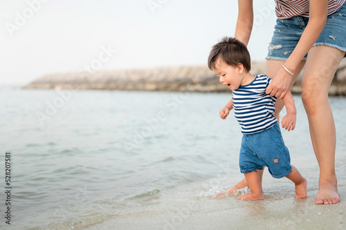 Baby boy making his first steps on the beach with his mother