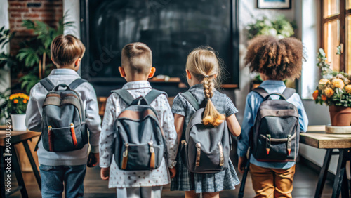 Back to school scene featuring four children with backpacks, standing in classroom. atmosphere is filled with excitement and anticipation for new school year