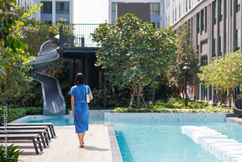 Back view of a young woman in blue dress walking by a luxury swimming pool at a modern residential condominium in Bangkok, Thailand.