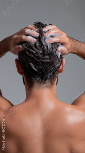 Back view of man washing hair with shampoo foam, highlighting daily hygiene and scalp care routine.
